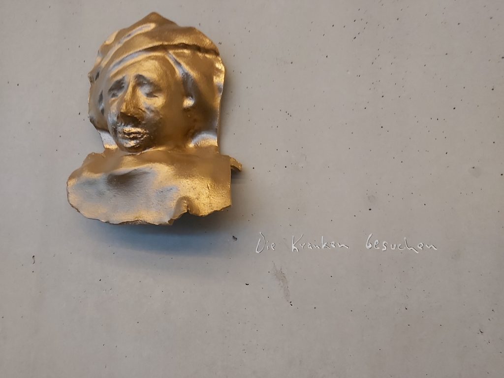 Bildunterschrift: Kranke besuchen (Werke der Barmherzigkeit von Künstler Tobias Kammerer in der Aussegnungshalle Empfingen)
