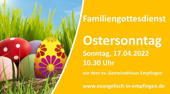 Am Ostersonntag, 17.04.2022, um 10.30 Uhr, feiern wir einen Familiengottesdienst vor dem ev. Gemeindehaus: Ostern gemeinsam erleben, Osterfreude teilen, uns erinnern, dass Jesus lebt und Macht hat. Darum geht es. Wir wollen auch einen großen Eierbaum schmücken, wer dazu bunte Eier beisteuern möchte, darf die gerne bei Pfarrer Gruber abgeben. Herzliche Einladung an alle Großen und Kleinen zum Gottesdienstfeiern und zum anschließenden Ostereiersuchen am Weiherplatz.