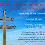 Diakon Blaise Gouget und Pfarrer Christoph Gruber bereiten diesen Gottesdienst vor. Parkplätze sind beim Kloster Kirchberg. Nach kurzer Wanderung erreicht man in ca. 15 Minuten den Gottesdienstort auf markante Hochfläche. Menschen mit Einschränkungen können begrenzt PKW auch oben abstellen. Picknickdecken und Sonnenschutz sind gute Begleiter. Genügend Sitzgelegenheiten sind vorhanden. Die Pfadfinder Kings Scouts unterstützten das Organisationsteam. Imbiss und Getränke werden vorbereitet. Beginn ist jeweils 11.00 Uhr. Am jeweiligen Tag informiert das Wettertelefon (07485 8424020).