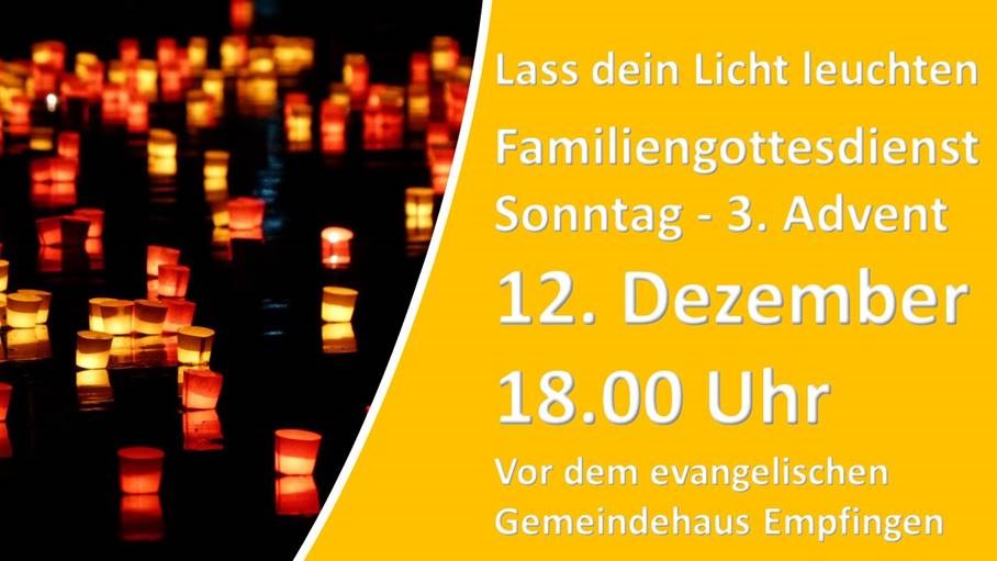 Am Sonntag, 12.12.2021, um 18.00 Uhr, laden wir herzlich zu einem Familiengottesdienst vor dem evangelischen Gemeindehaus Empfingen ein. Das wird ein Gottesdienst, bei dem ganz viele Leuchtbecher den Platz vor dem Gemeindehaus erhellen. Ein Gottesdienstangebot für große und kleine Adventsfans. An diesem Tag holen die Pfadfinder das Friedenslicht von Betlehem nach Empfingen. Wenn alles klappt, wird es im Gottesdienst bei uns ankommen. Wer es gleich mit nach Hause nehmen möchte, sollte eine Laterne für den sicheren Transport mitbringen. Zu diesem Gottesdienst sind alle eingeladen: Große und Kleine, Familien und Singles, Omas und Opas, Kerzenfans und Weihnachtsmuffel… einfach alle! Es gilt das bewährte Hygienekonzept, mit dem sehr gut Gottesdienst im Freien gefeiert werden kann! Vor dem evangelischen Gemeindehaus ist viel Platz, so dass Abstand gar kein Problem ist. Wir laden herzlich dazu ein!